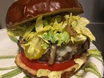 Includes cheese, pickles, grilled onion, lettuce, Datil Mustard and Bar B Q Sauce.